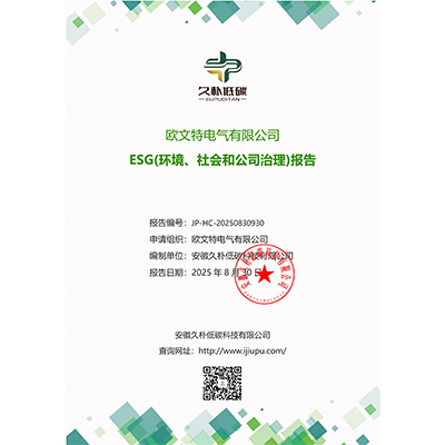 欧文特电气有限公司始终秉持可持续发展理念,积极履行企业社会责任。近日,公司委托安徽久朴低碳科技有限公司编制的《ESG(环境、社会和公司治理)报告》(报告编号:JP-HC-20250830930)正式完成。